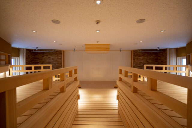 上映を行う2階ホールサウナ「演むすび」は、映画鑑賞のために特別な設定を施しています。室温は通常のサウナより低めの45度から50度に設定。息苦しさを感じることなく、じっくりと作品を楽しんでいただけます。